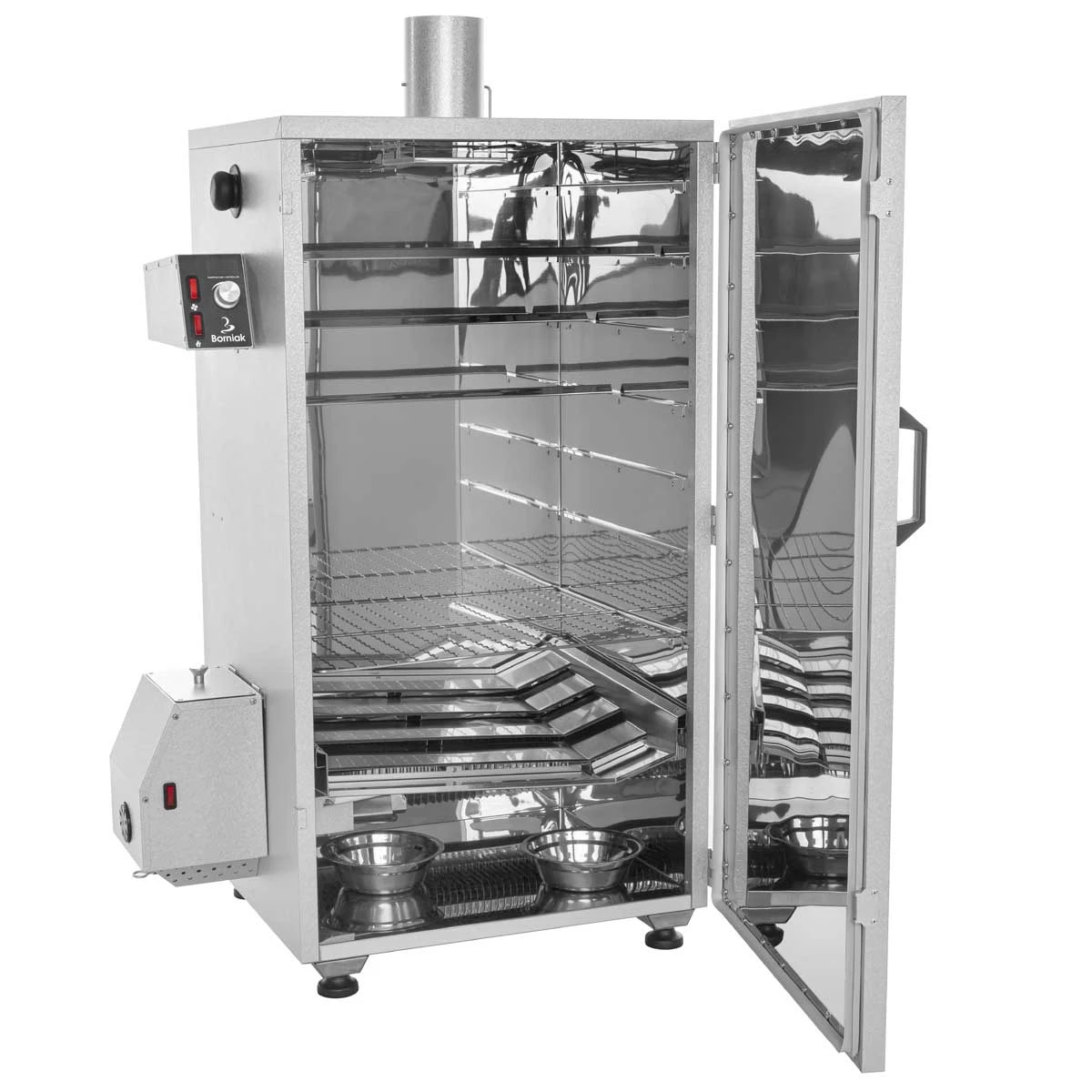 Die Intensität von Rauch und Räucheraroma reguliert Ihr ganz komfortabel am Kaminrohr durch eine mit verstellbarem Schieber. So kann, je nach Geschmack und Rezept, die richtige Rauchmenge einfach geregelt werden. Eine unterhalb des Kamins verhindert, dass Rauchkondensat auf die geräucherten Waren abtropft.