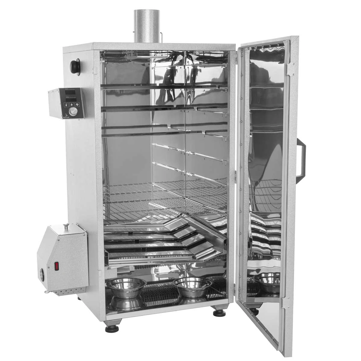 Die Intensität von Rauch und Räucheraroma reguliert Ihr ganz komfortabel am Kaminrohr durch eine mit verstellbarem Schieber. So kann, je nach Geschmack und Rezept, die richtige Rauchmenge einfach geregelt werden. Eine unterhalb des Kamins verhindert, dass Rauchkondensat auf die geräucherten Waren abtropft.