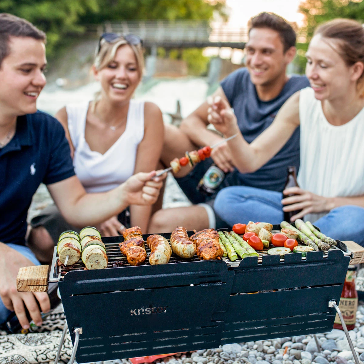 Beide Grillroste lassen sich nebeneinander nutzen oder in verschiedenen Höhen, so habt Ihr sogar die Möglichkeit . Der zweite Grillrost hat dichtere Streben und eignet sich besonders gut für kleinteiliges Grillgut wie Garnelen, Nürnberger und geschnittenes Gemüse. - : Zuerst zieht Ihr die beiden Korpusteile auseinander, dann klappt Ihr die Tragebügel nach unten um, bis sie hörbar einrasten. So hat der Knister auf jedem Untergrund einen soliden Stand.