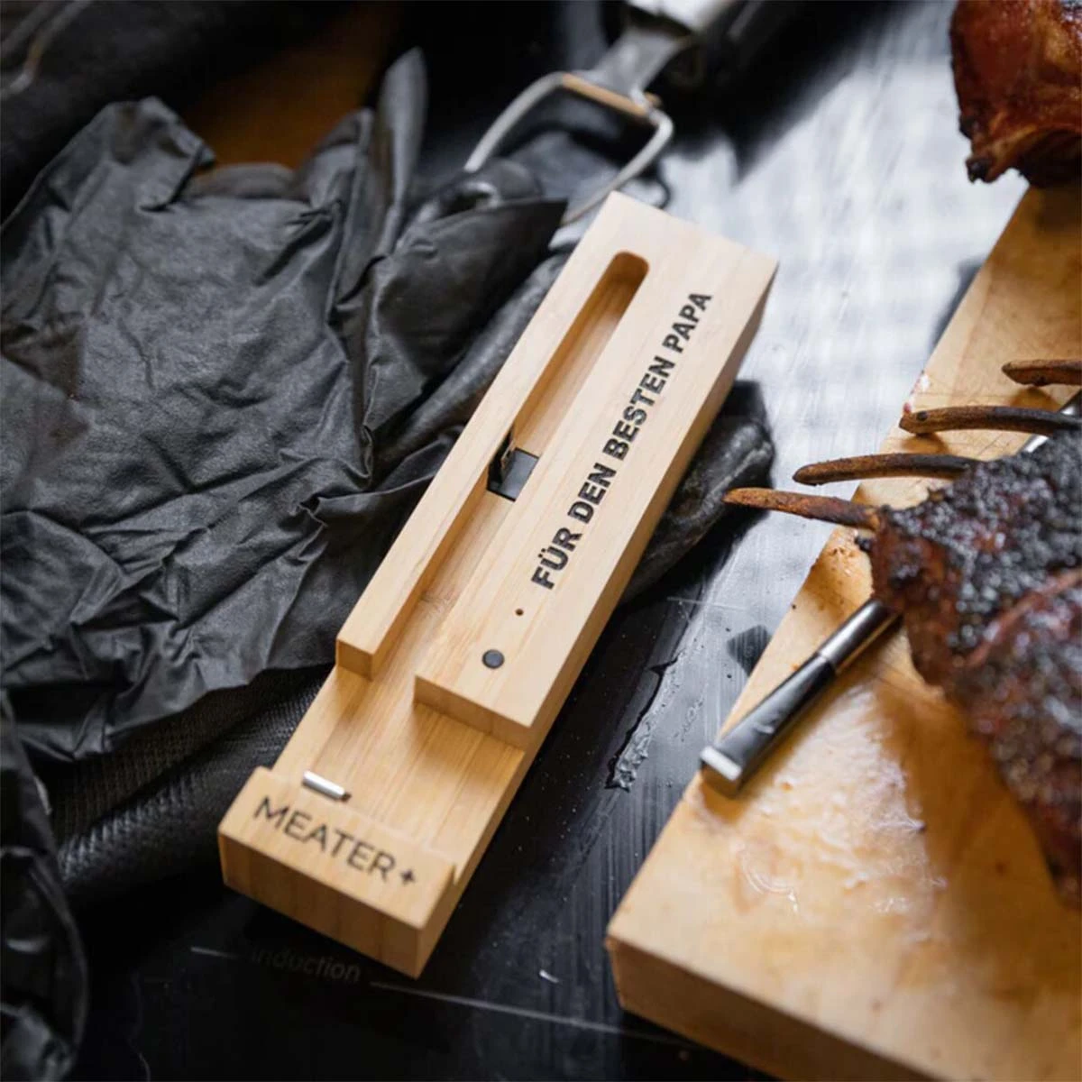 Alle MEATER Thermometer werden mit einer Bambusladestation geliefert und sind mit ihrem eleganten Design ein Hingucker in jeder Küche. Die Temperaturfühler sind aus gebürstetem, rostfreiem Edelstahl und hitzebeständiger Keramik gefertigt, leicht zu reinigen und spülmaschinenfest!