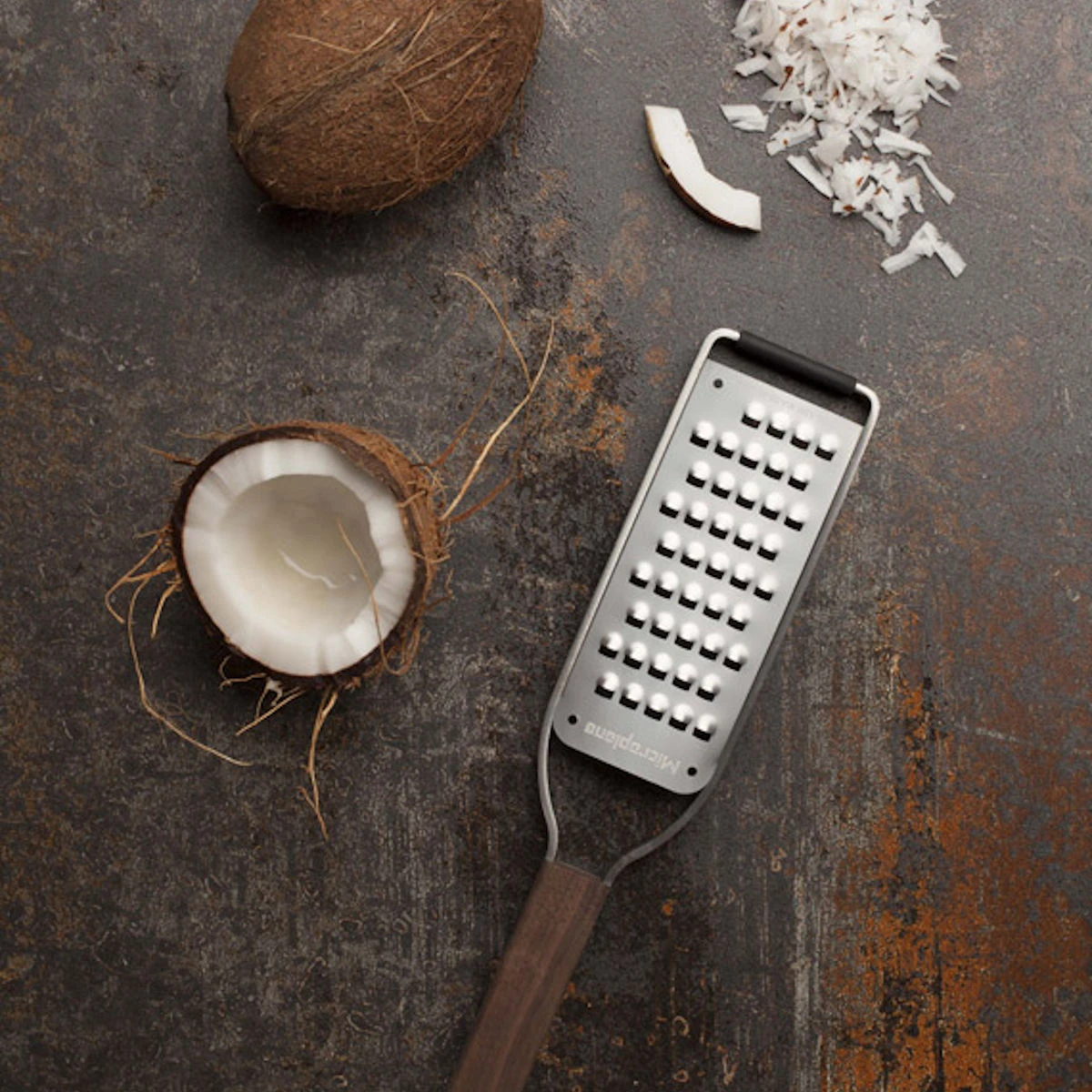 Die grobe Reibe von Microplane ist für verschiedene Lebensmittel geeignet, darunter: Kartoffeln, Zucchini, Möhren, Äpfel, Kohl, Weichkäse und viele weitere.