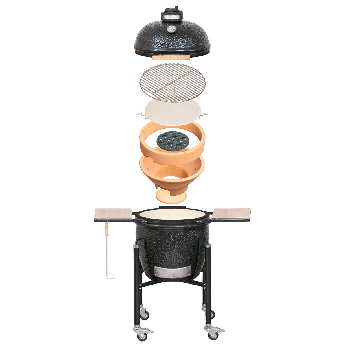Ergänzt durch umfangreiches Zubehör, wie Rotisserie, Gussrost, Pizzastein, Wokhalter & Wok oder Feuerplatte wird der Monolith Basic zur vollwertigen Außenküche. Der Grill ist nur in der Farbe schwarz erhältlich. Lieferbar als Version mit Gestell und Seitentischen aus Bambus. Optionales Zubehör, Grilltools und Accessoires findest du auf unseren Zubehörseiten.