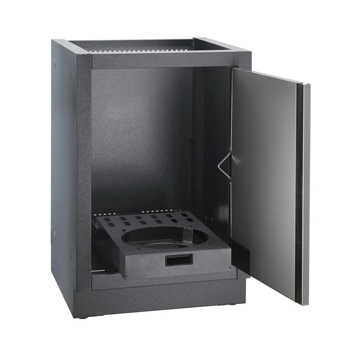 Der Oasis Gasflaschenschrank besteht aus pulverbeschichtetem, verzinkten Stahl. Die Edelstahltür könnt Ihr links oder rechts montierten und an Eure Außenküche optimal anpassen. Zudem verfügt der Outdoorschrank über eine ausziehbare Schublade für die Propangasflasche, die sie stabil hält und Euren Rücken beim Austausch der Gasflaschen schont. Die vier Nivellierfüße sorgen für eine perfekte Anpassung, sodass Eure Outdoor-Küche auf jedem Untergrund sicher steht.