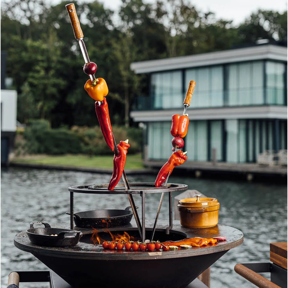 - Ein komplettes OFYR Brasilianisches Grill-Set mit Grillring, Halterung und Spießen ist optional erhältlich.