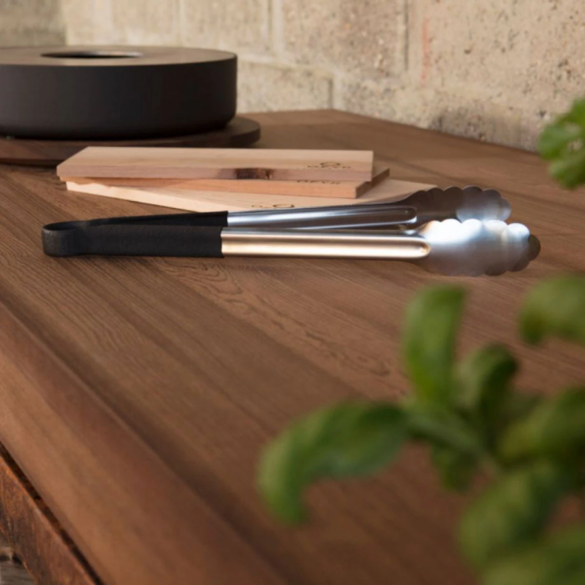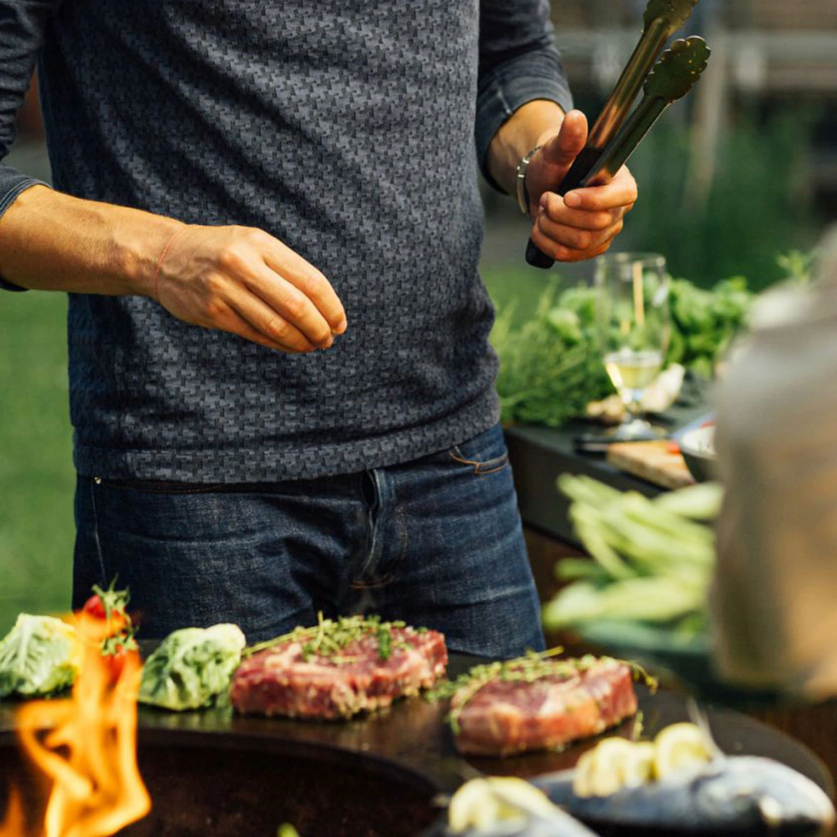 Alles im Griff an der Grillstation: Die OFYR Grillzange aus robustem Edelstahl ist mit ihrer das ideale Werkzeug, um an Planchas und Feuerplatten zu arbeiten. Vor allem im Zusammenspiel mit einem Grillspachtel spielt die OFYR Grillzange auf der Feuerplatte ihre Vorteile aus und sorgt für ein komfortables Drehen, Wenden und Servieren.