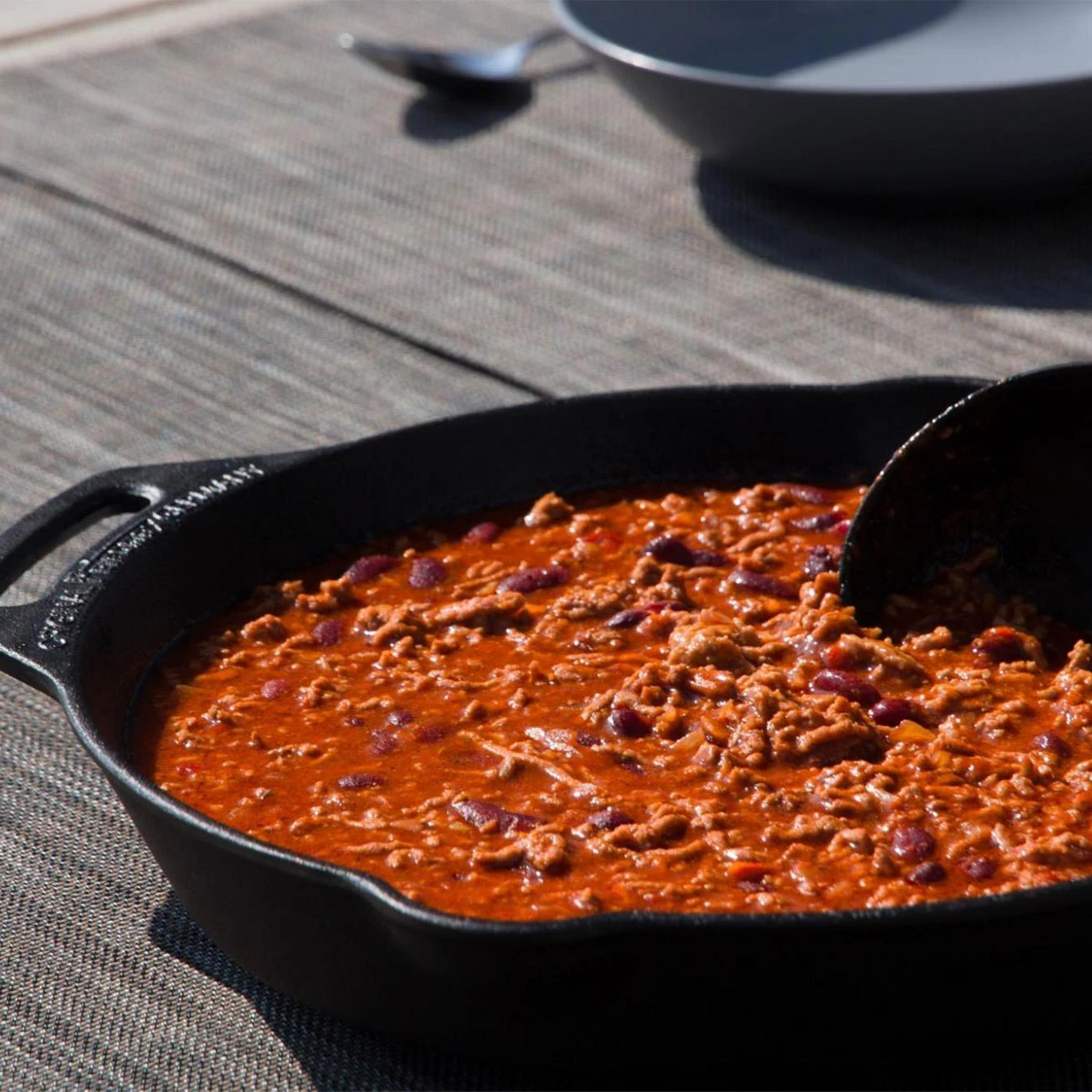 - Mit einem eignet sich die große Gusspfanne für vielerlei Gerichte und mehrere Portionen.