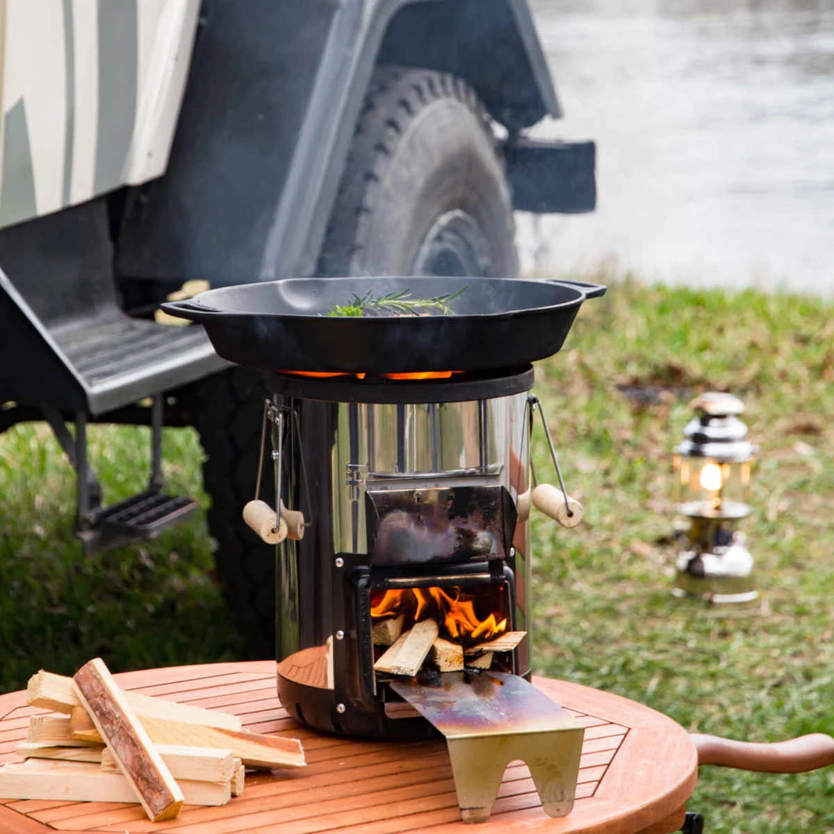 Mit diesem autarken Herd seid Ihr auch unterwegs flexibel und könnt Eurer Kreativität freien Lauf lassen. Mit den passenden gelingt Euch nicht nur ein herzhaftes Frühstück mit Bacon und Ei, sondern Ihr könnt auch Steaks scharf anbraten oder hervorragende Bratkartoffeln zubereiten. Für einen leckeren Eintopf beim Camping ist der Raketenofen selbstverständlich auch mit , wie Dutch Oven, Gusspfannen und -woks ab einem Durchmesser von 20cm kompatibel. Mit dem lässt sich zudem aromatischer Tee oder Kaffee zubereiten.